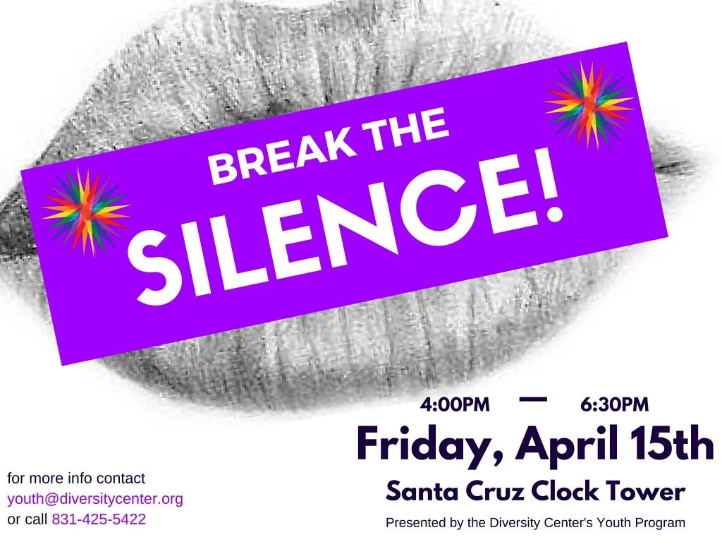 Back to All Events LGBTQ Youth Breaking the Silence Rally Friday, April 15, 2016 4:00 PM 6:30 PM Santa Cruz Clock Tower 101 Water St Santa Cruz, CA, 95060 United States (map) Google Calendar ICS Calling all LGBTQ youth! Stand up to bullying, discrimination, and all of the nasty LGBTQ+ phobias! Rally at the Santa Cruz Clock Tower and show your resilience!.
