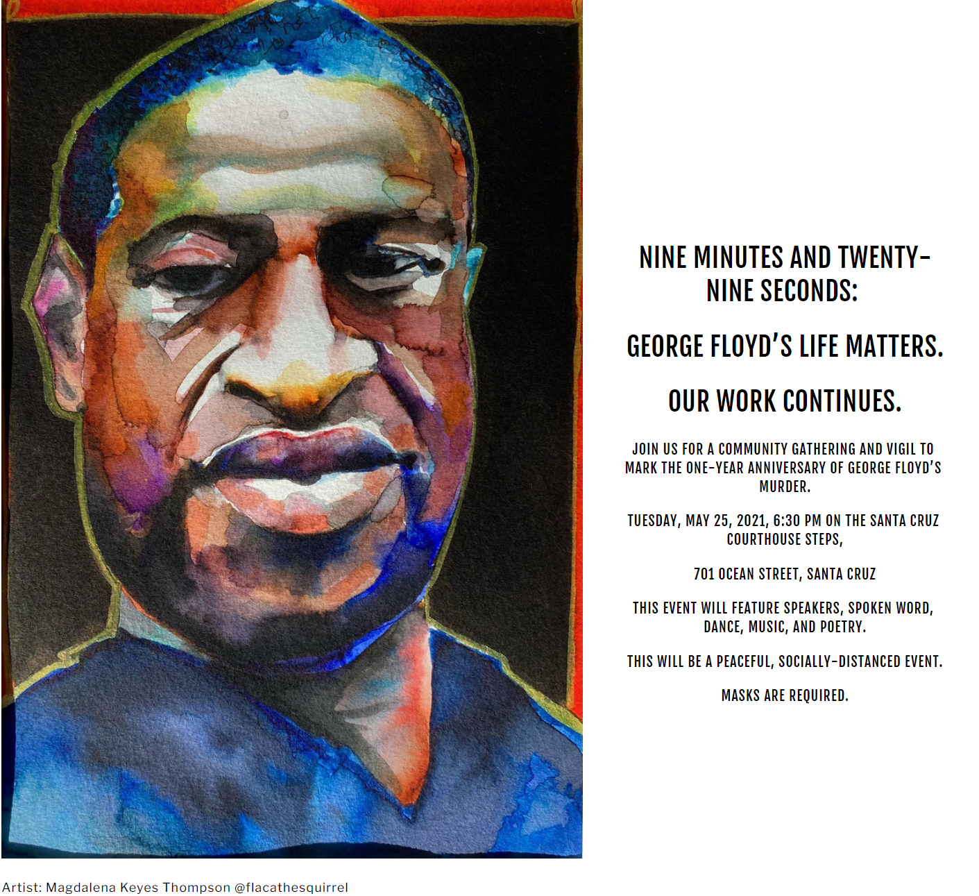 George Floyd Commemoration Event: Please join us May 25th at 6:30 pm on the Santa Cruz Courthouse steps for a peaceful, socially distanced community gathering to commemorate the one-year anniversary of George Floyd's murder. We will honor his memory by recommitting to continue the work for justice and accountability.