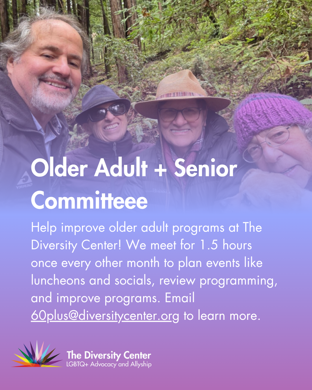 Help improve older adult programs at The Diversity Center! We meet for 1.5 hours once every other month to plan events like luncheons and socials, review programming, and improve programs. Email 60plus@diversitycenter.org to learn more.