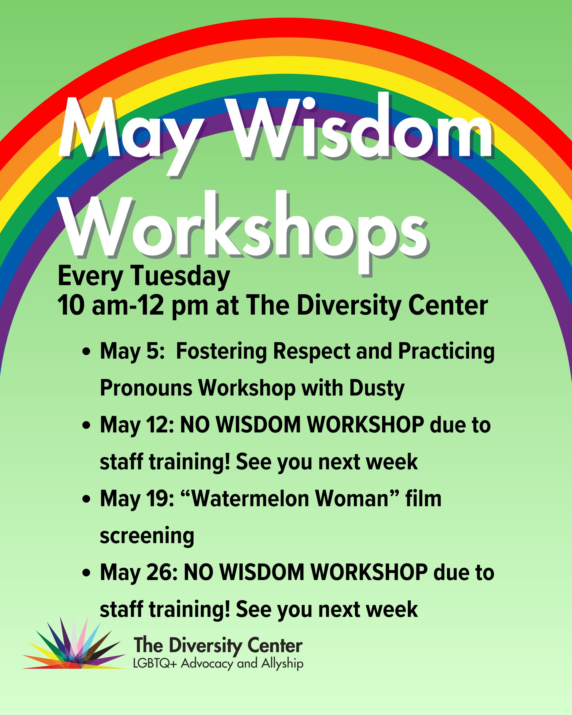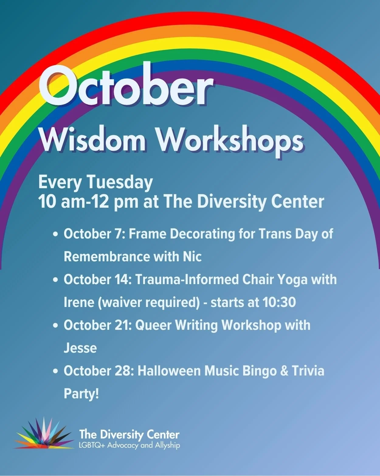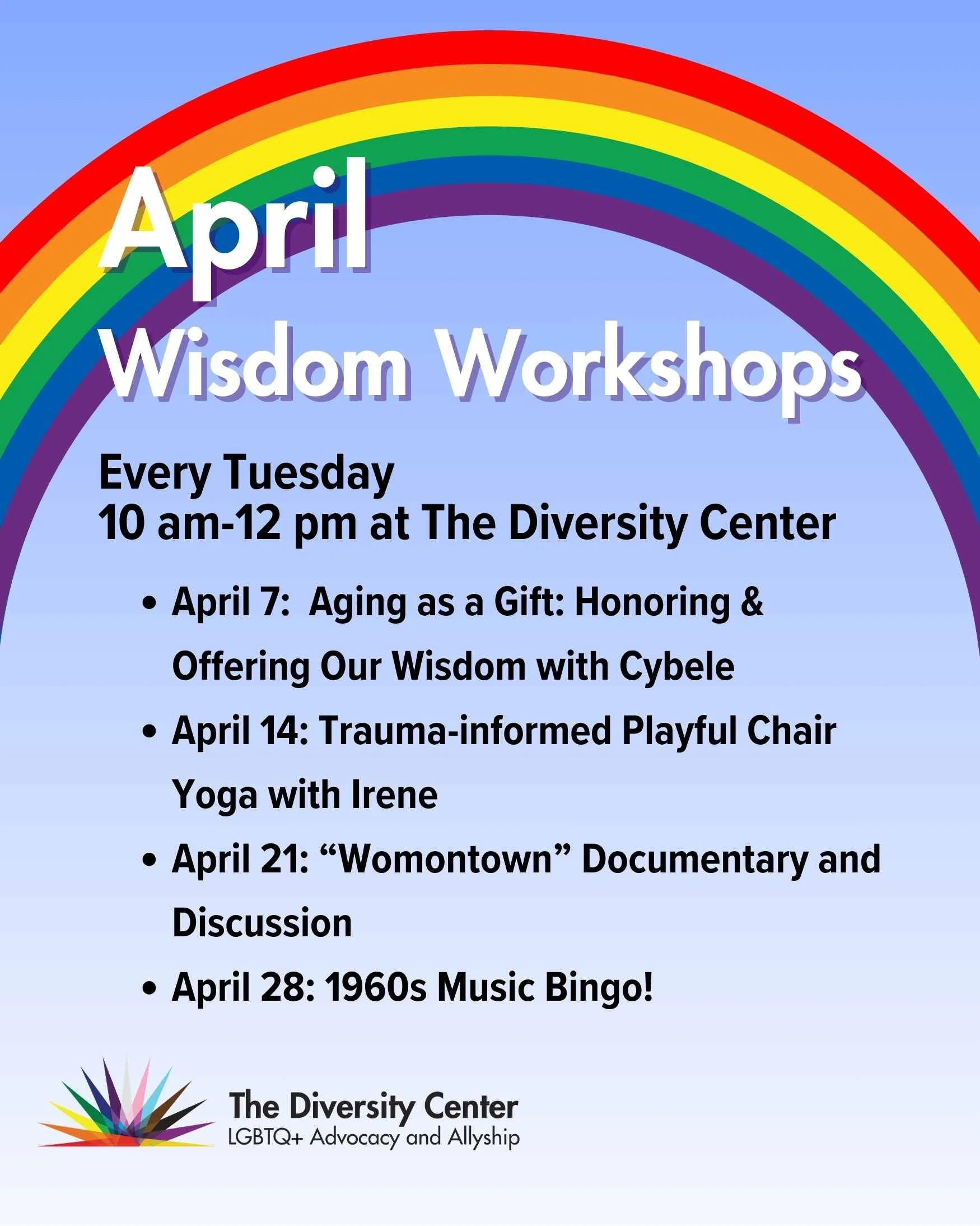 Our Wisdom Workshops are weekly sessions created specifically for LGBTQ+ older adults, offering a supportive space to explore topics that nurture physical, emotional, and mental well-being. Each week features a new focus, with workshops that include Trauma-Informed Chair Yoga, Music Bingo, Elder Abuse Awareness, Understanding SOGIE (Sexual Orientation, Gender Identity, and Gender Expression), LGBTQ+ Movie Screenings, and Ecological Awareness.