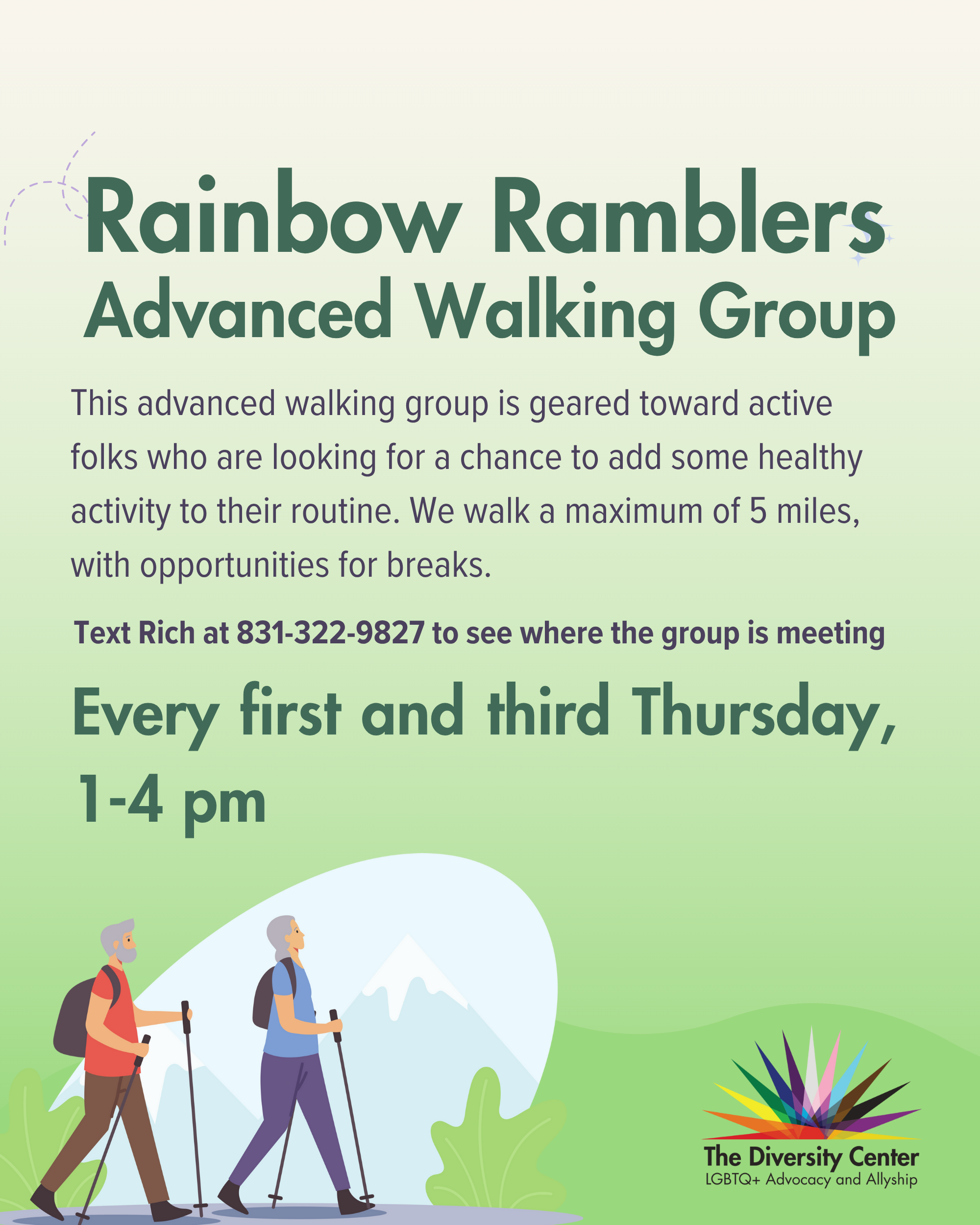 This advanced walking group is geared toward more active folks who are looking for a chance to add some healthy activity to their routine. Though we are not speed walkers, we aim for light aerobic exercise, walking a maximum of 5 miles, with opportunities for breaks as needed. Text or call Rich at 831-322-9827 to get added to the Whats App and see where and when the group is meeting.