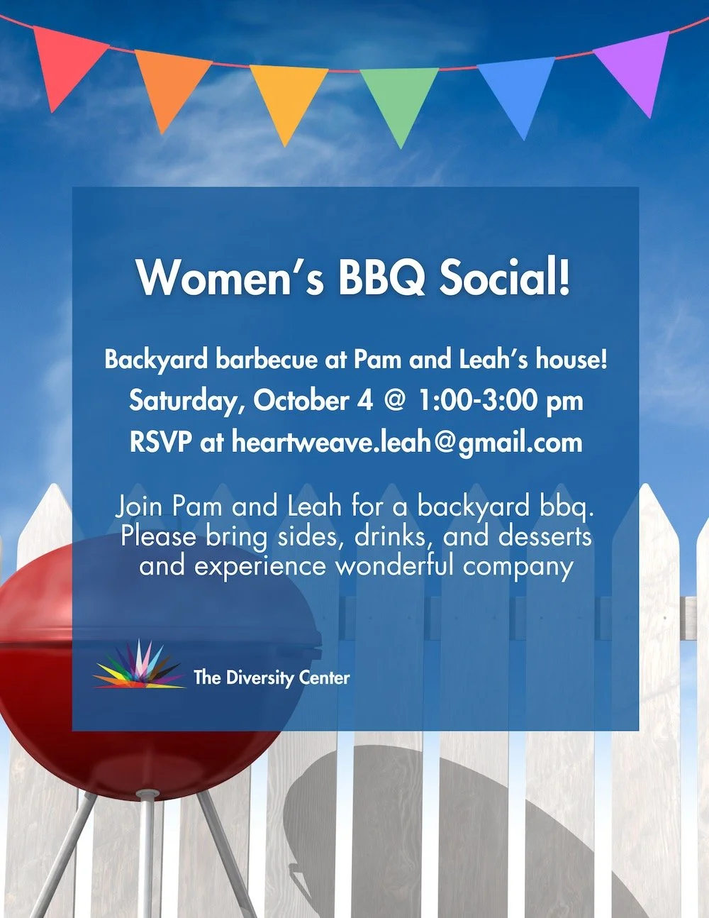 Join your community of older LGBTQ+ women for laughs, food, and connection. Leah and Pam are hosting this social. They will provide a BBQ. Please bring snacks, sides, drinks, dessert, and especially yourself! RSVP email or text to get the address, directions and parking details. heartweave.leah@gmail.com or (831) 239-5007 Note: there are stairs and a hand rail to access the property.
