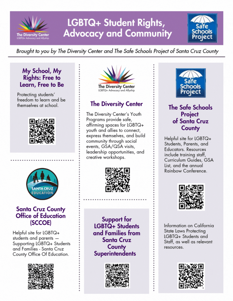 The Diversity Center offers support to Santa Cruz County schools by visiting Gender-Sexuality Alliances (GSAs) and providing educational presentations and training for students and staff.