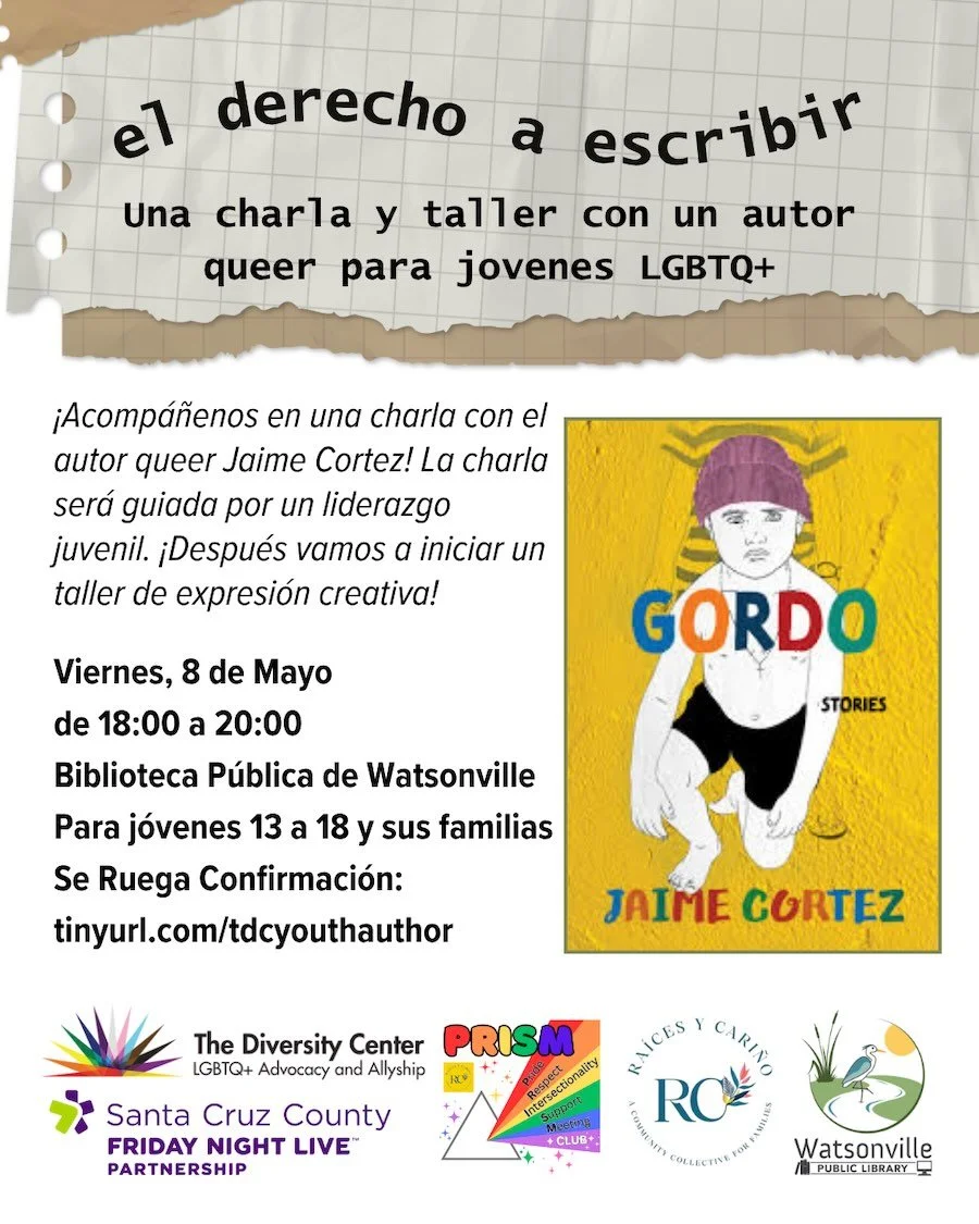Join us for a conversation with author and graphic novelist Jaime Cortez, followed by a creative expression workshop! This event is a collaboration between The Diversity Center, PRISM, Raíces y Cariño, and the Watsonville Public Library.