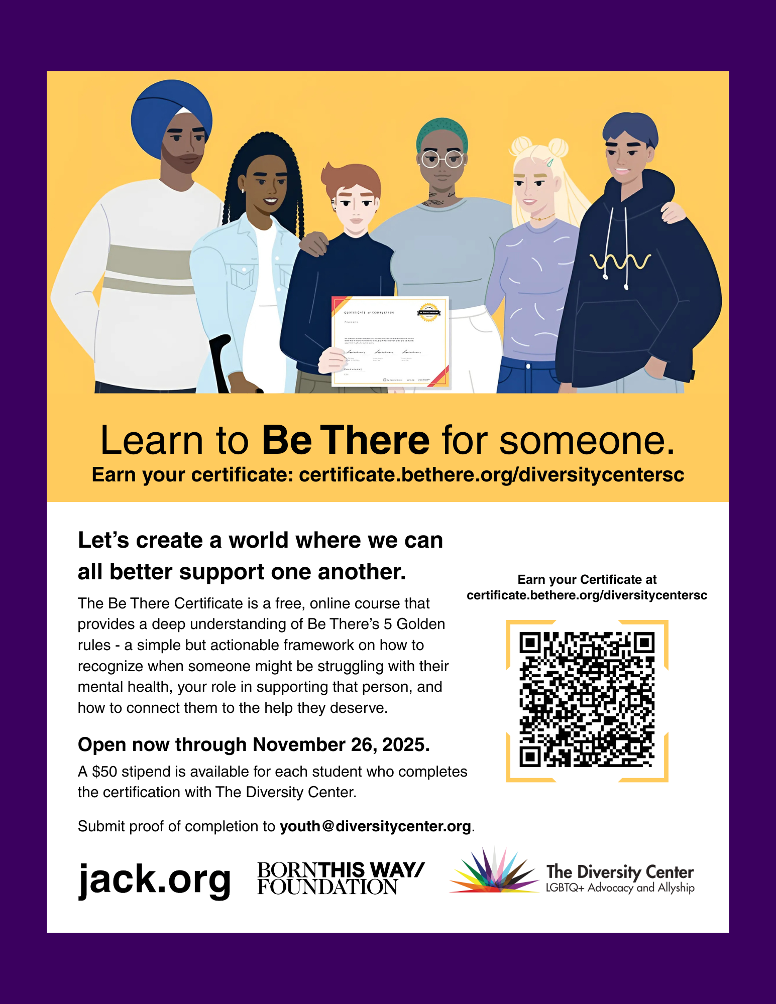 The Be There certificate, created by Jack.org in partnership with Lady Gaga’s Born This Way Foundation, is a free, self-paced, interactive online course designed to equip young people with the knowledge, skills, and confidence to support someone struggling with their mental health. Upon completion of the program, youth will become Be There Ambassadors.