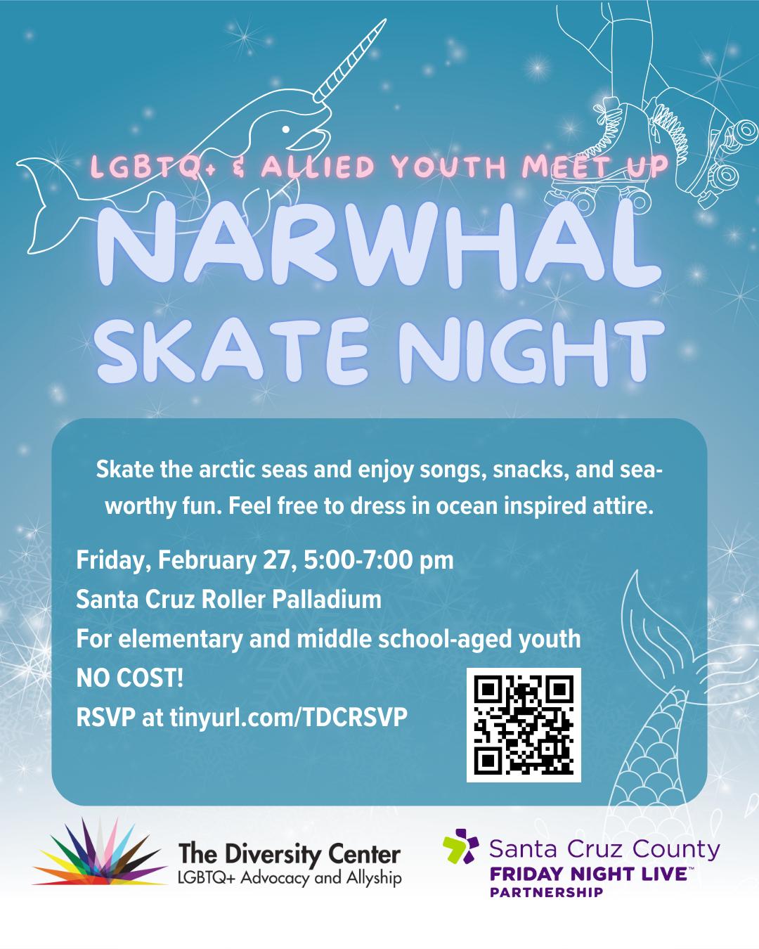 Skate the arctic seas and enjoy songs, snacks, and seaworthy fun with new friends from across Santa Cruz County schools! Dress to impress in your best sea creature attire. This event is NO COST. RSVP required for a ticket. This event was made possible with support from Branciforte Middle School’s Muskequeers and Gault Elementary’s QSA Club!